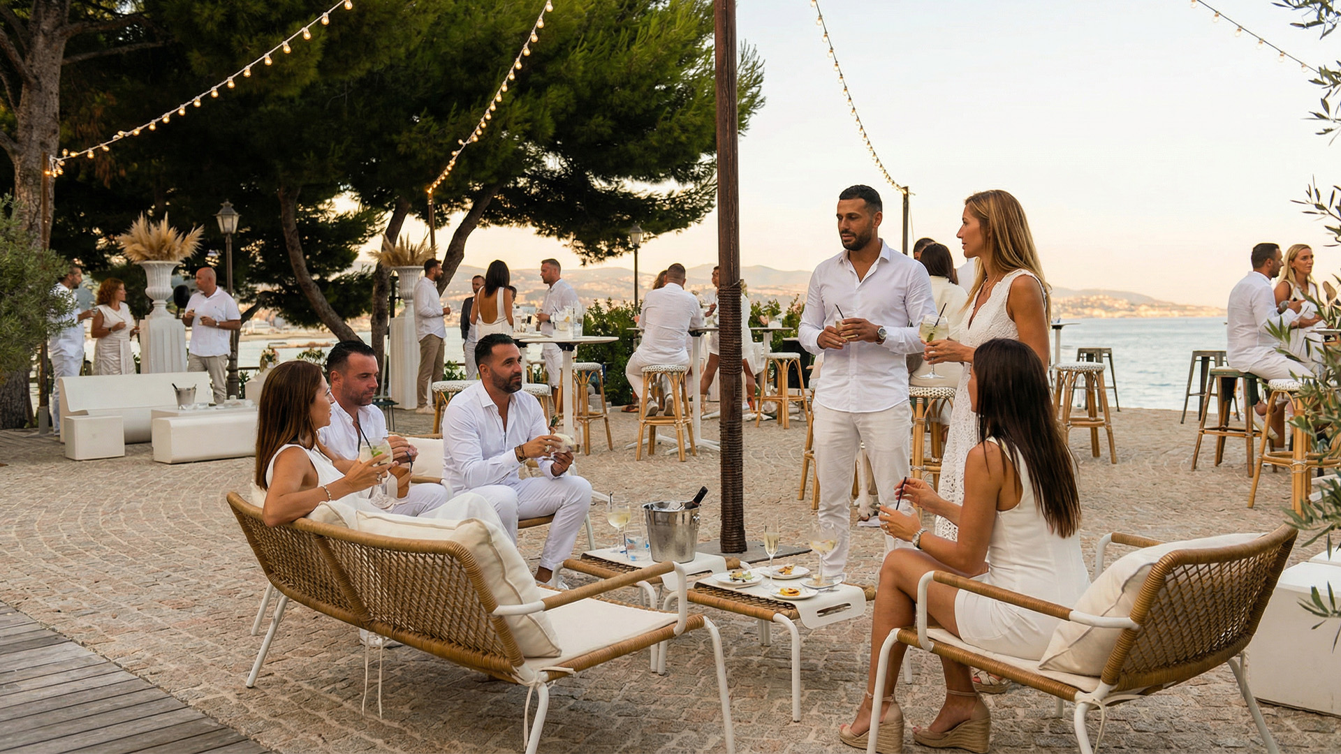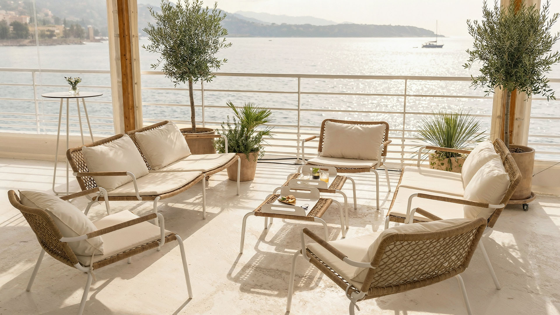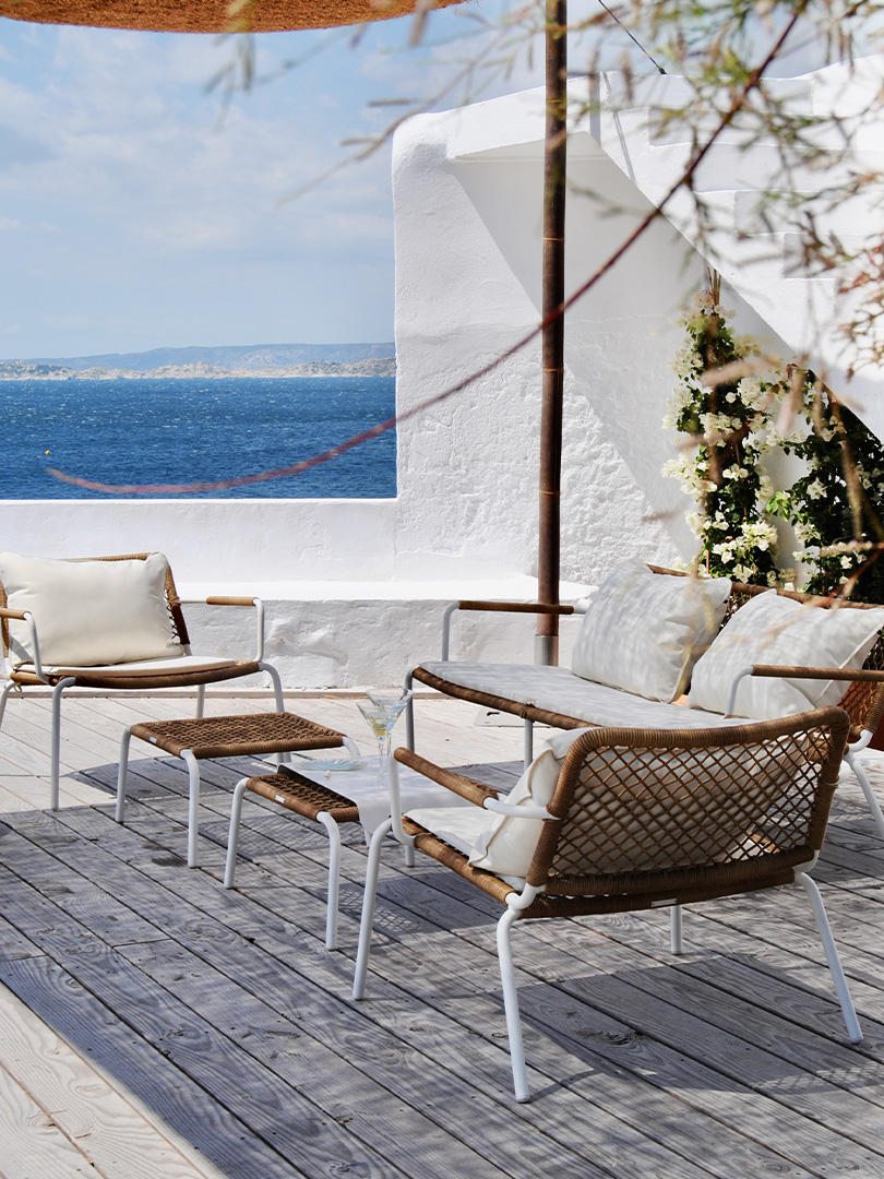 The Ipanema lounge set is available for hire to create a bright, clean lounge area that is extremely easy to integrate. Its matte white aluminium frame delivers a crisp line and excellent stability, enhanced by braided rope detailing that adds texture without weighing down the overall look. The Ipanema furniture is supplied with off white seat cushions and backrests, providing immediate comfort and a light, clear finish that works particularly well outdoors, on a terrace, around a pool, under a structure or within a cocktail area. An effective option for creating a controlled summer atmosphere, with furniture that reads clearly even in large spaces.