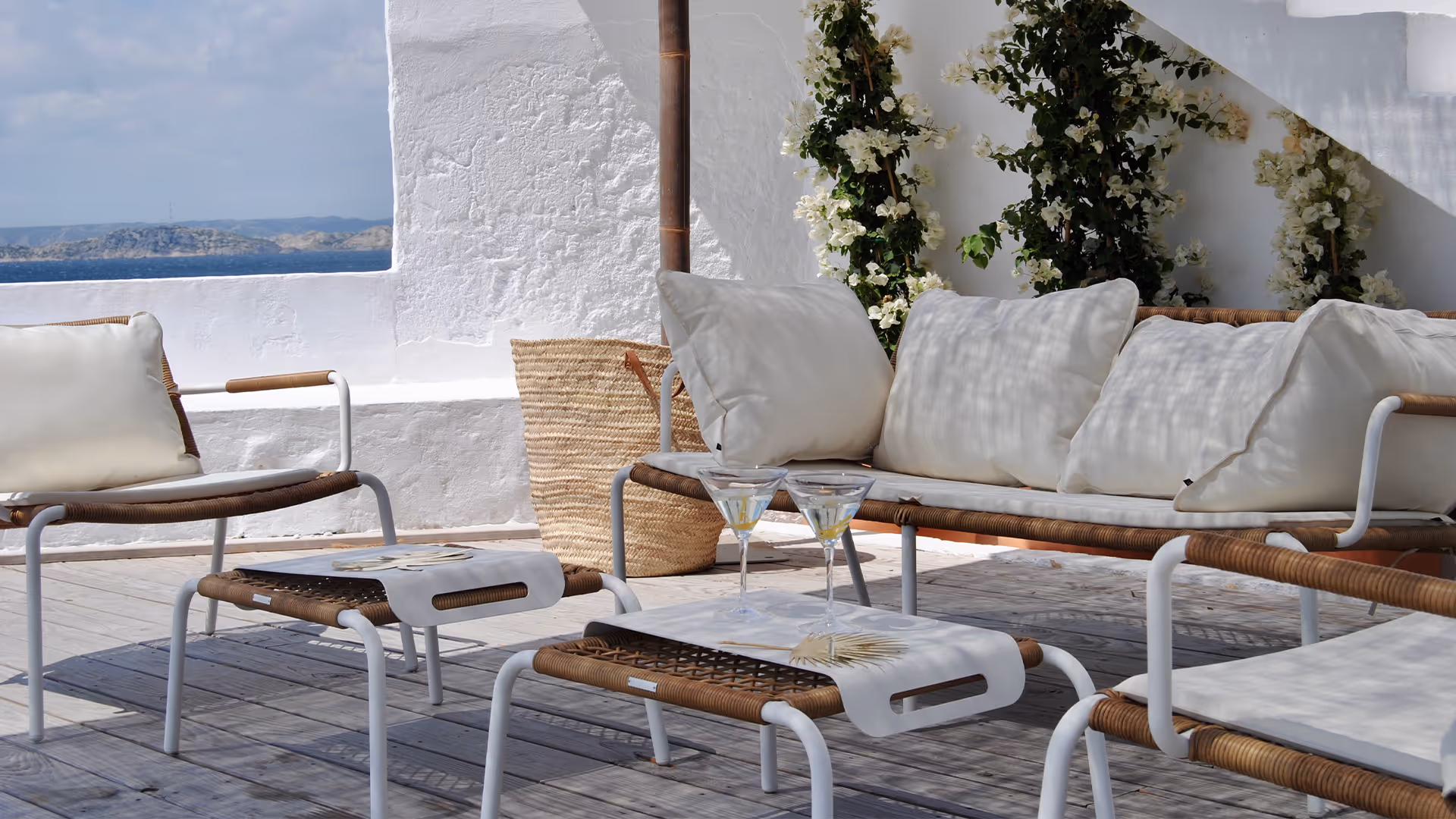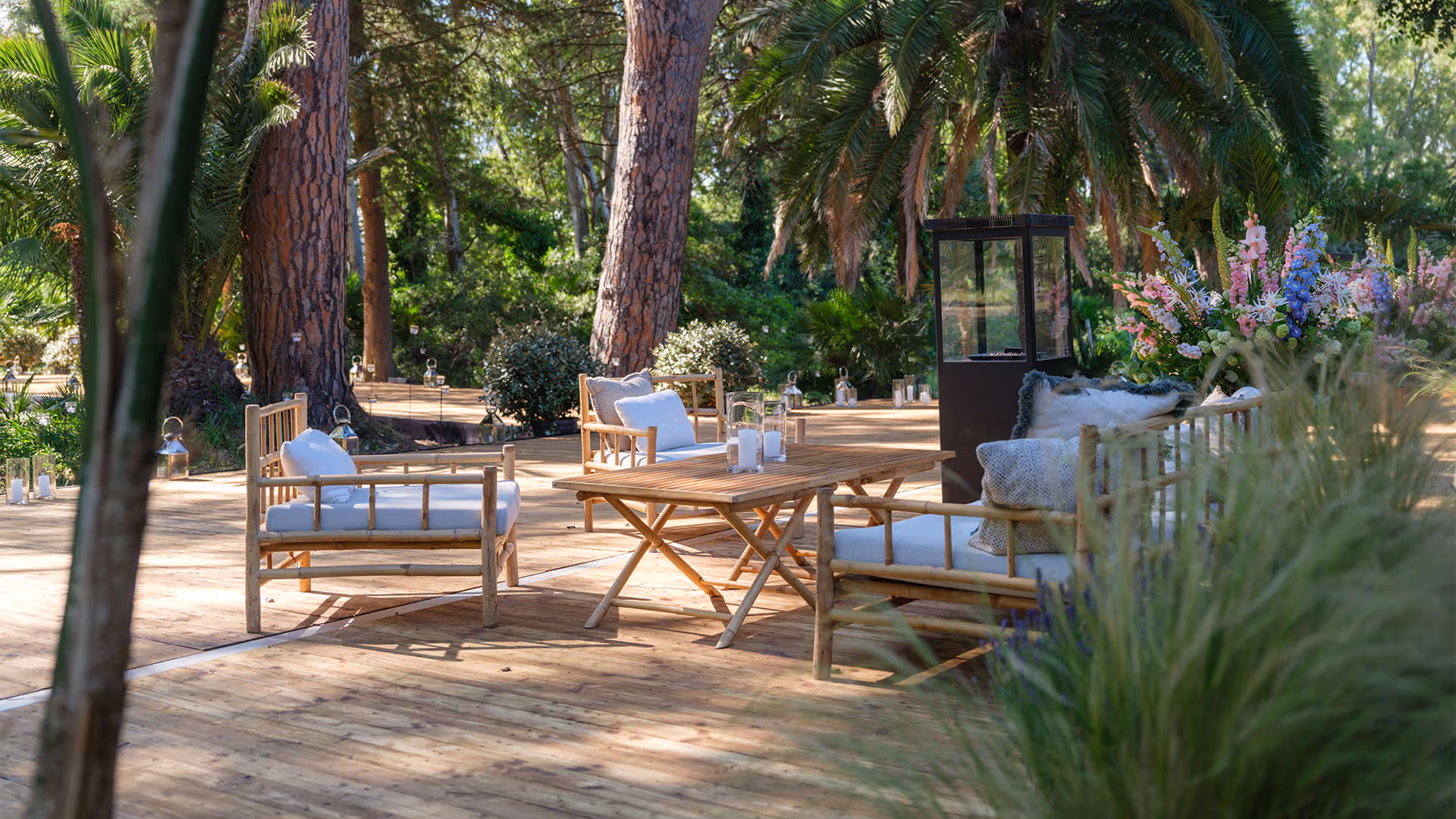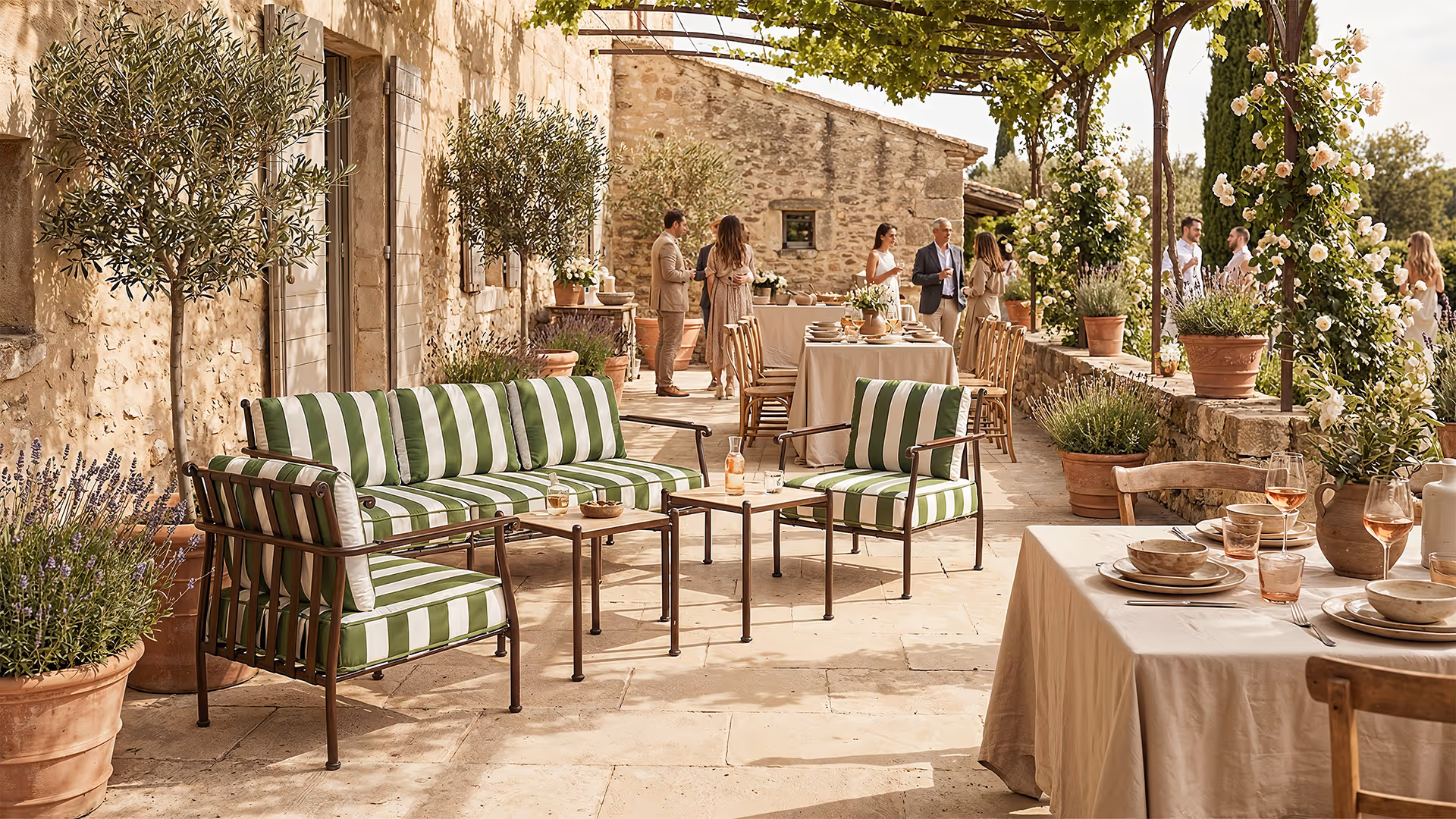The Provence lounge set is available for hire to create a welcoming, well structured space, suitable for both indoor and outdoor settings. The Provence furniture is supplied with sunproof and waterproof cushions, designed for event use and worry free installation, even in changing conditions. The powder coated aluminium frame with a wrought iron look brings a refined line and excellent structural stability, while the ceramic tabletop adds a durable, easy to maintain finish. Available in five models, the Provence lounge set allows for the creation of a coherent, modular and immediately legible space for your guests.