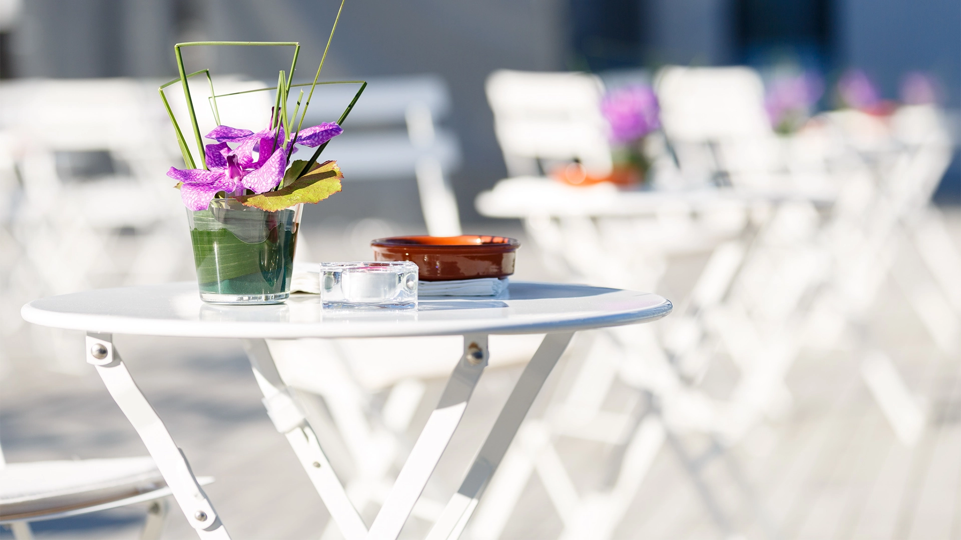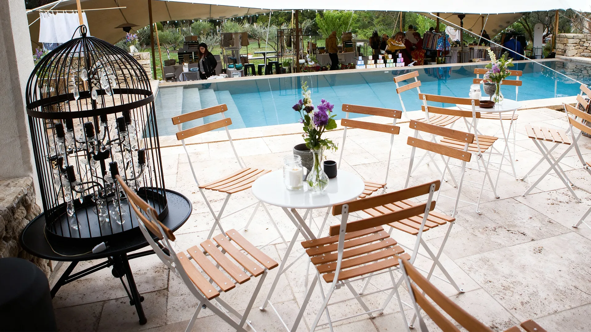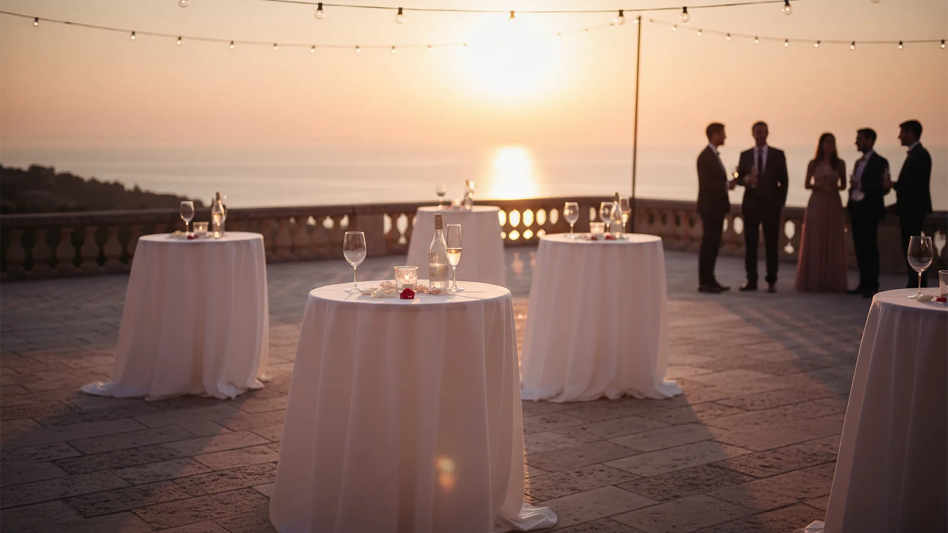 Practical and refined, the white pedestal table fits easily into any reception space. Designed to be covered with a tablecloth, it is perfectly suited for both cocktail parties and outdoor dinners.