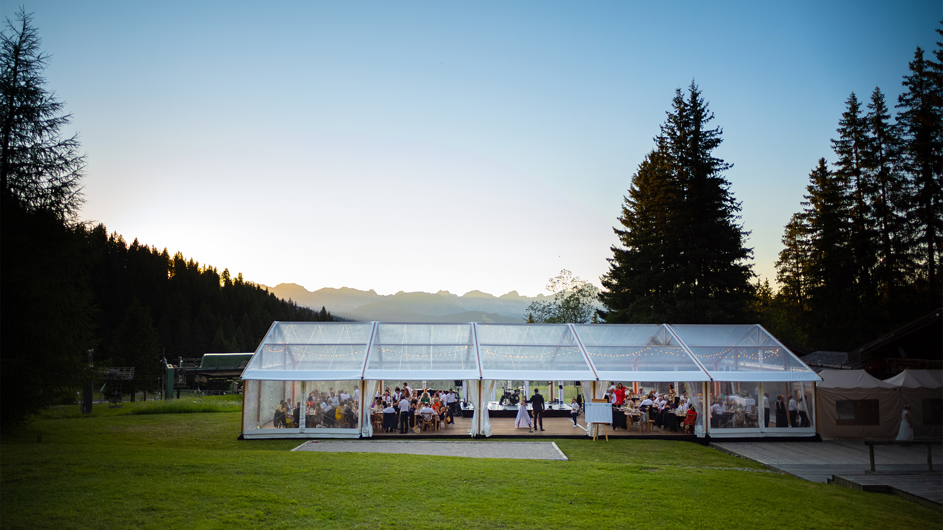 Self supporting and fully enclosable thanks to a roof and flexible PVC walls, the Woodline offers a protected and comfortable space that adapts easily to different seasons and uses. Natural light flows freely throughout the structure, creating an open and welcoming atmosphere, ideal for both private receptions and professional events.