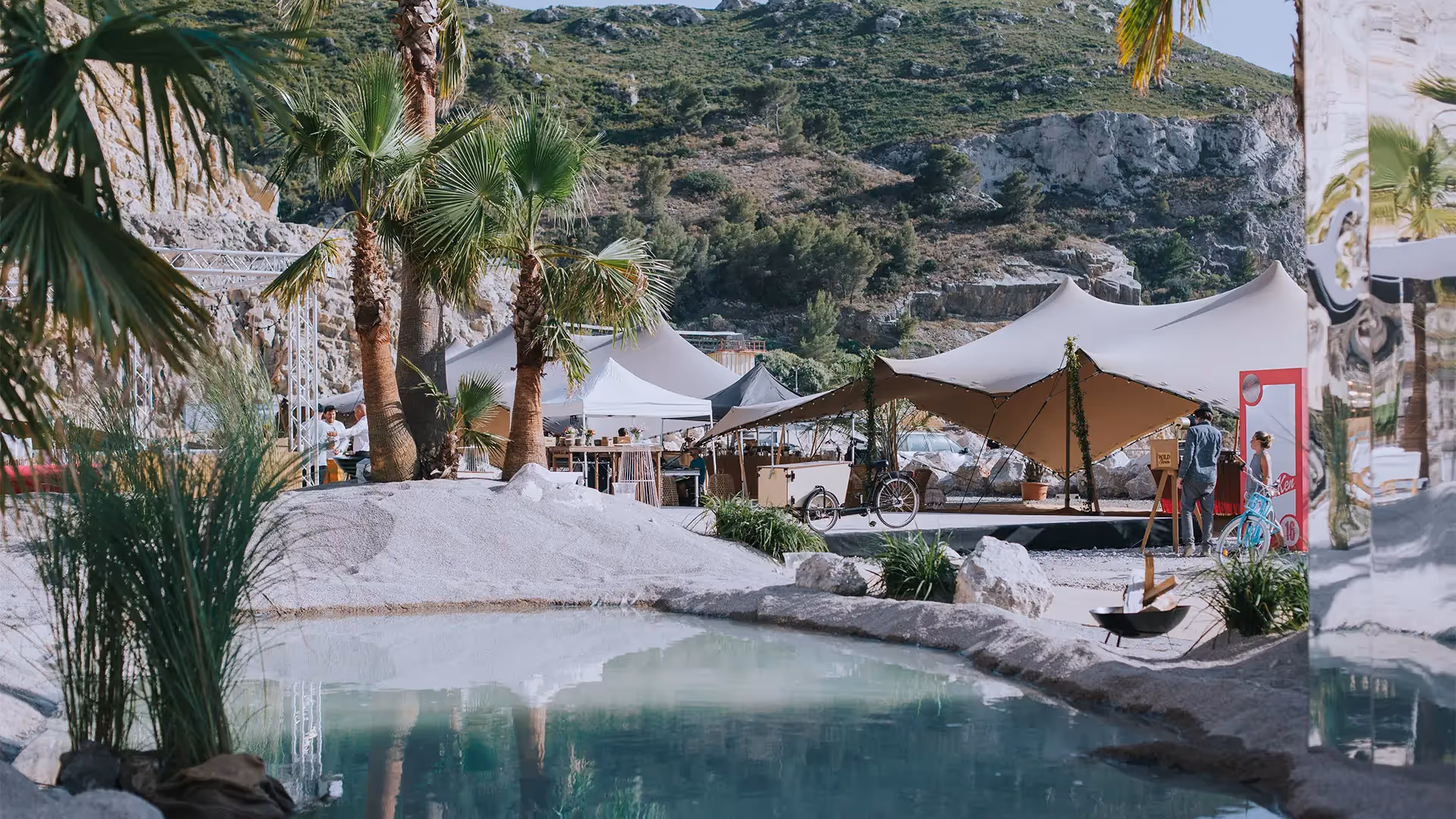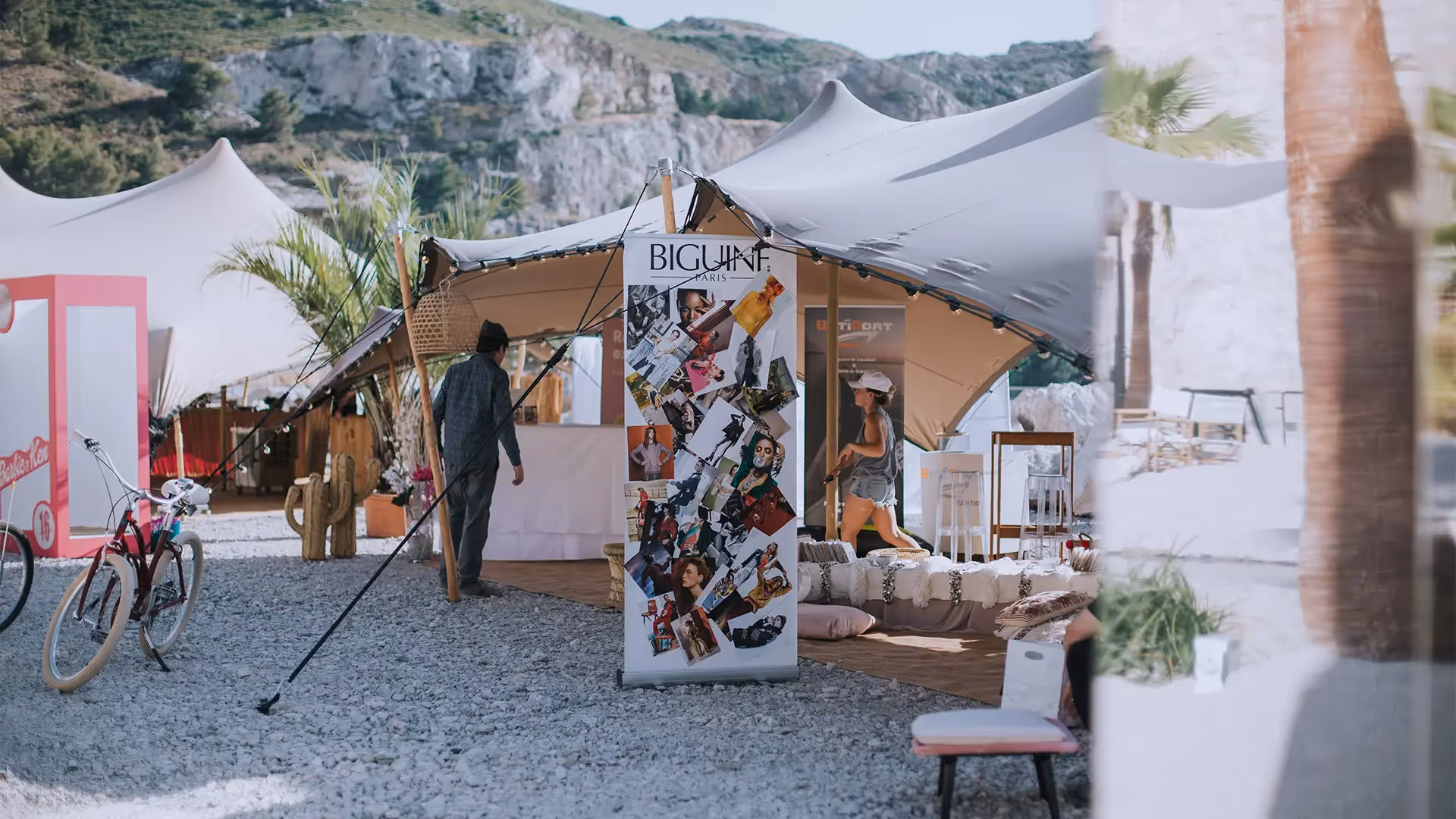 There, in the heart of the white stone, Be Lounge stretched its canvas like wings reaching for the sky. One 250 m² tent, one 170 m² tent, two of 150 m² and one of 60 m². Every curve, every tension followed the landscape, blending seamlessly into the raw setting of the site.