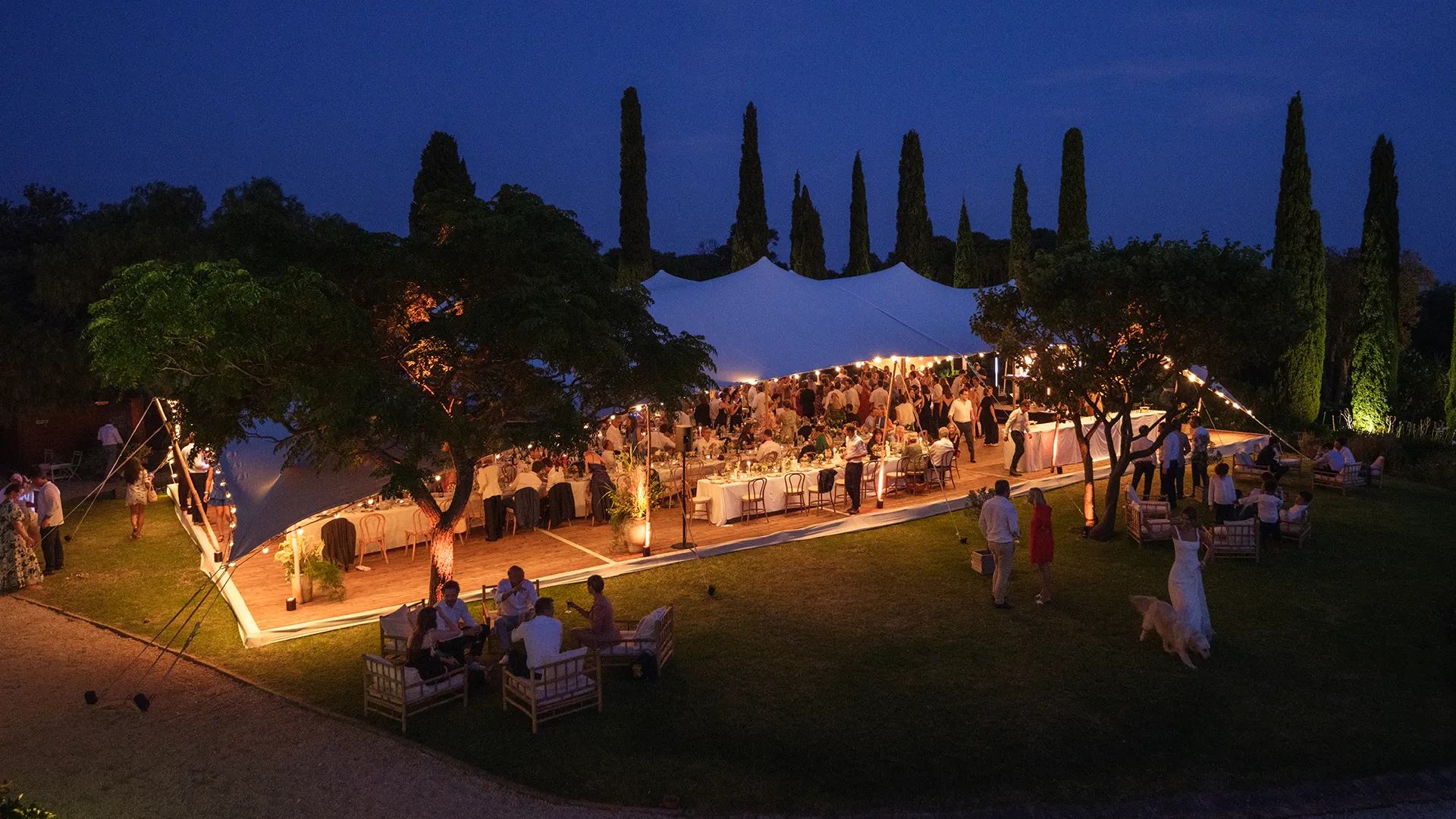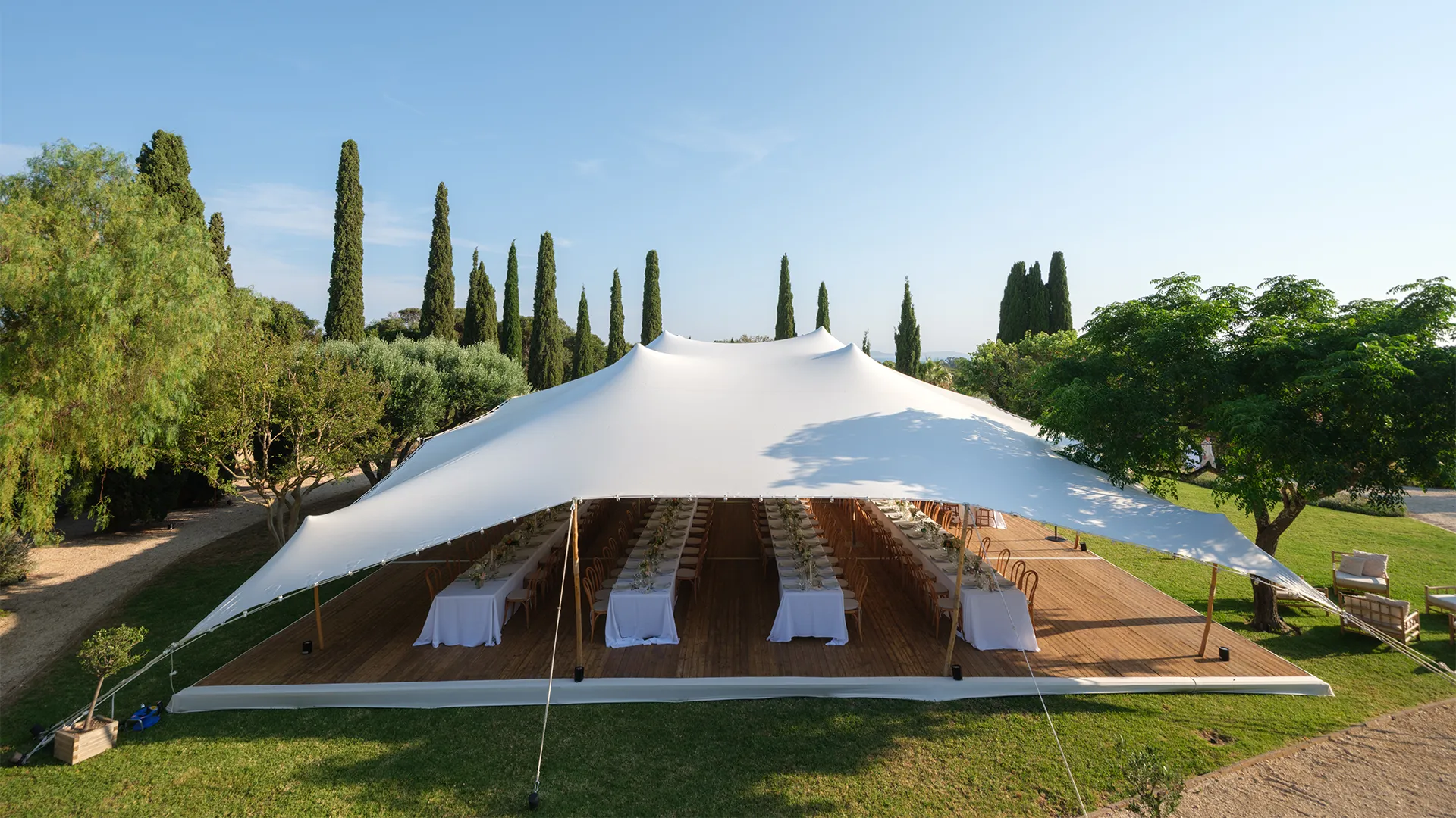 In the prestigious setting of Château de Brégançon, a 375 m² Stretch tent was installed to host a wedding in the heart of nature. Designed as an extension of the landscape, this imposing structure rested on a custom-made floor, perfectly integrated into the environment. With its taut lines and light canvas, it offered a space both open and sheltered, able to accommodate a large number of guests while maintaining a fluid and controlled atmosphere. This tailor-made configuration allowed for an optimized interior layout while ensuring optimal comfort despite the outdoor conditions. This project perfectly illustrates the adaptability of the stretch tent, even in the most demanding environments. A technical and aesthetic solution for large-scale events.