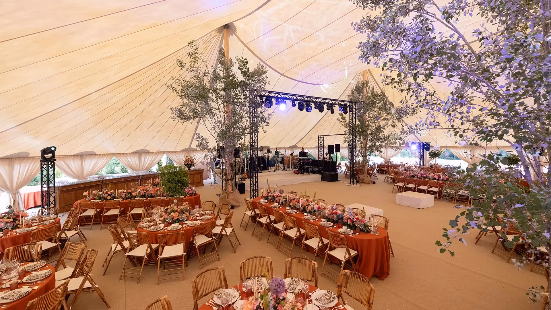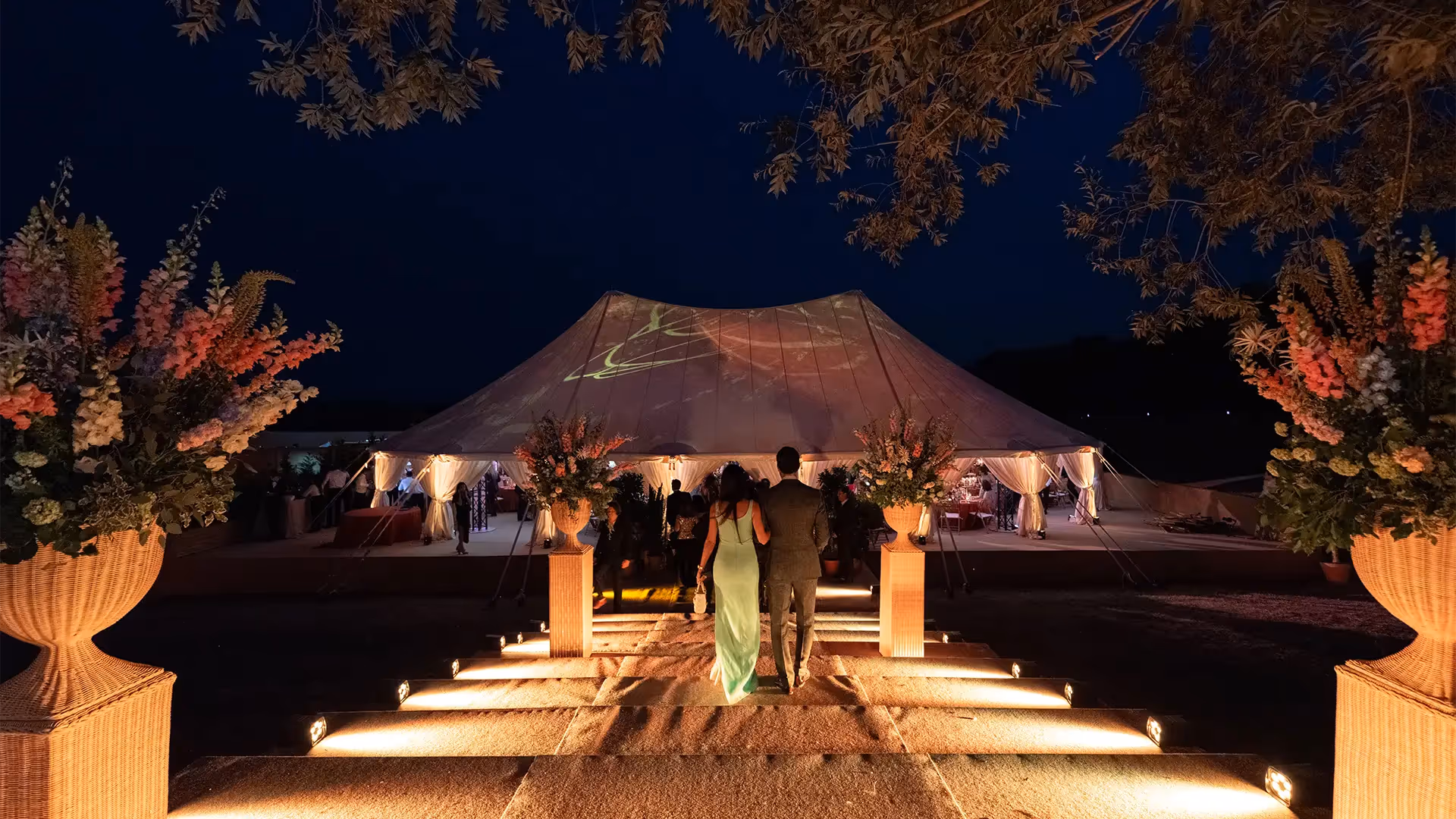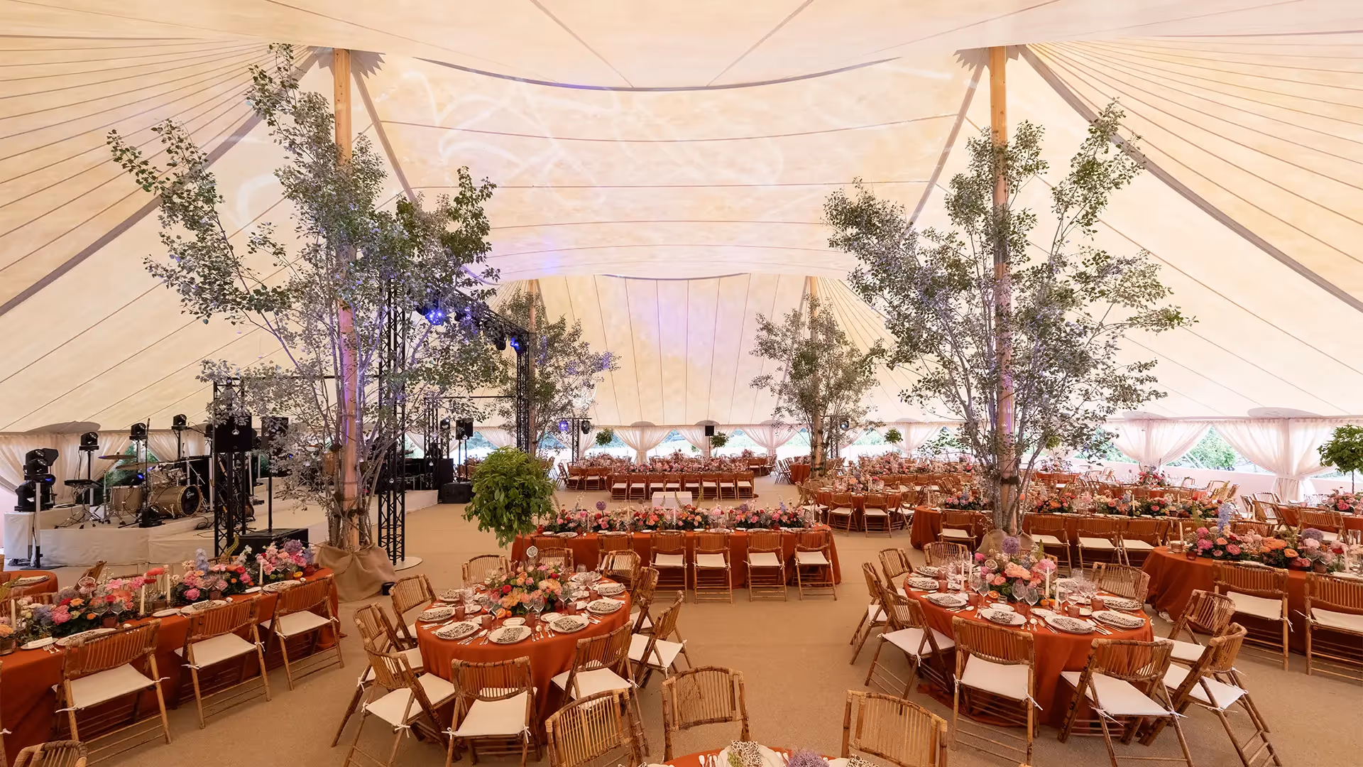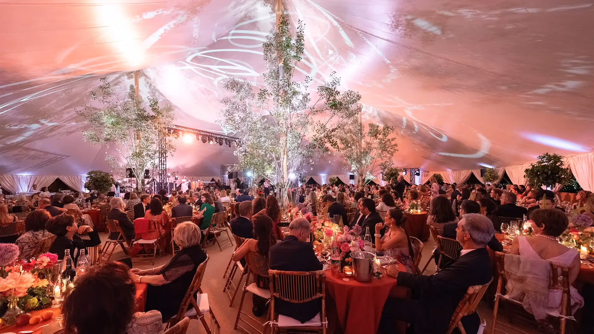 Inside, trees reached up to the ridge line, bathed in lighting projections that made the fabric ripple like a living sky. Tables were carefully set, conversations unfolded at their own pace, and eyes often lifted toward this soaring blend of greenery and textile.