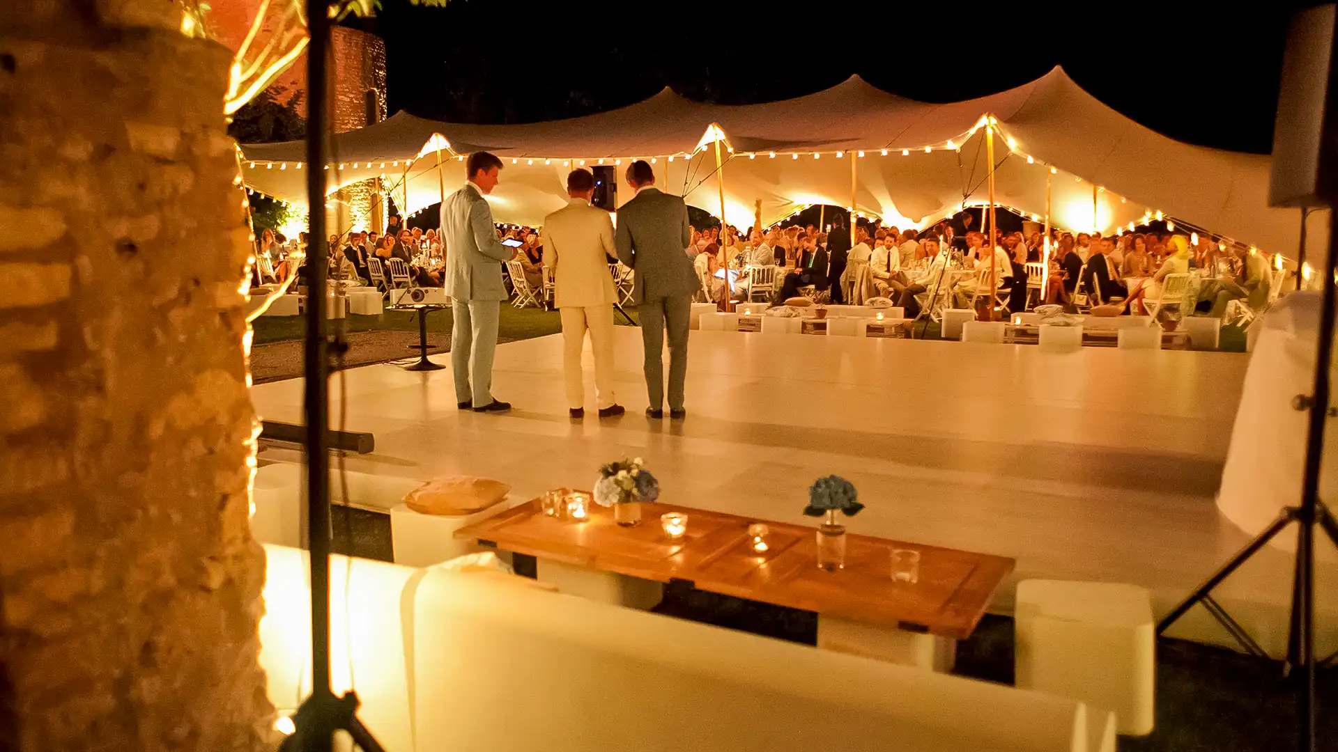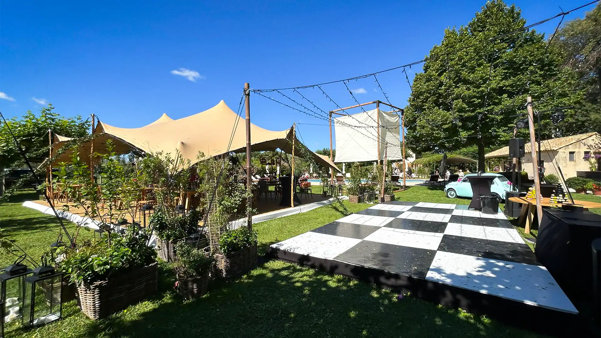 Our dance floor can be adapted to suit the number of guests, creating a dedicated area for your party! Installed on a metal frame to compensate for imperfections in the floor, it is 15 cm high.