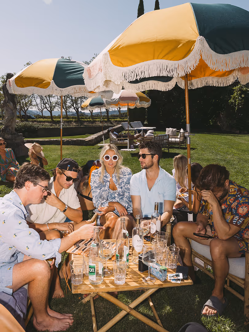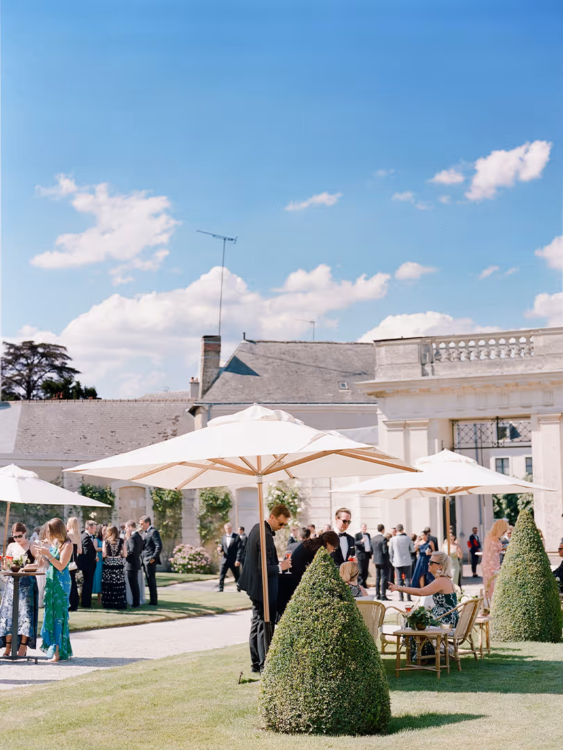 Les parasols structurent l’implantation, protègent du soleil et donnent un rendu propre et soigné sur photo, pour les événements privés comme corporate.