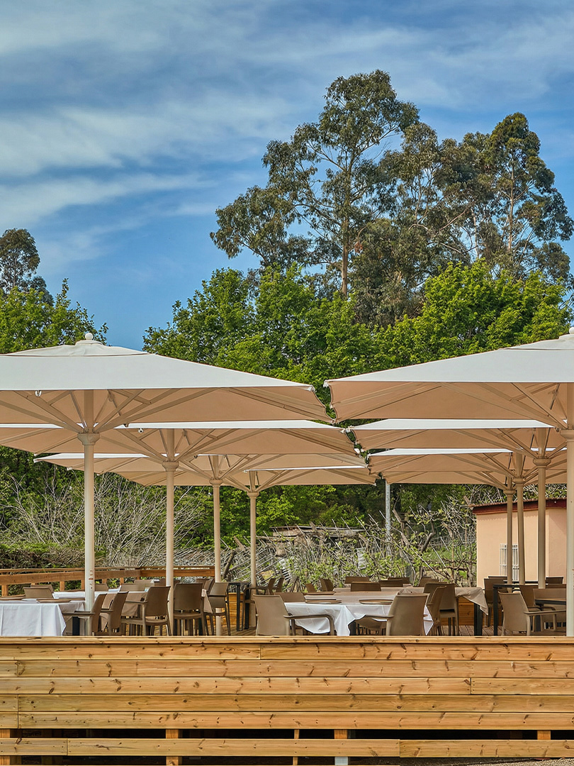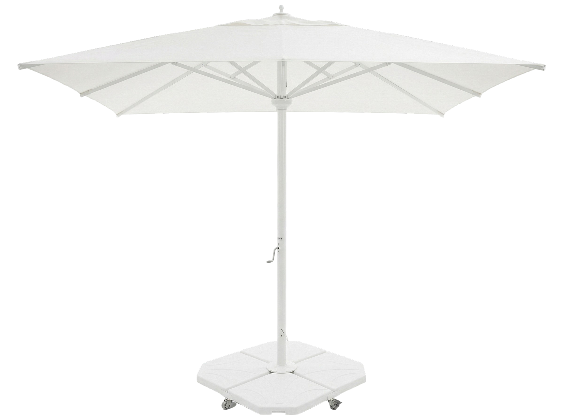 Parasol aluminium laqué blanc pour grande terrasse 4x4 m. 8 baleines interchangeables. Ouverture assistée manivelle. Télescopique.