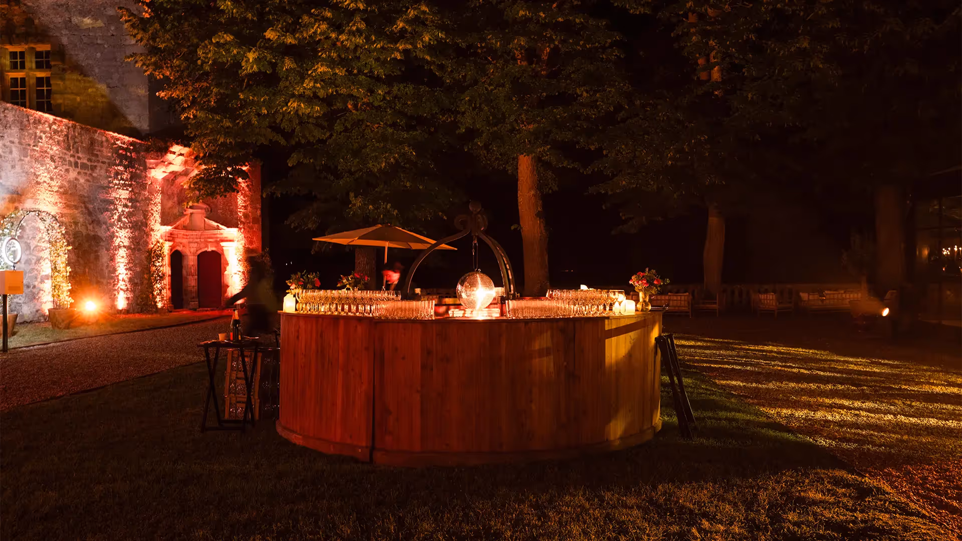 À l'extérieur, notre bar rotonde en bois massif invitait à la convivialité, tandis que de petits coins salons en bambou parsemaient l’espace comme des havres de respiration.La lumière, tamisée par les parois de verre, se mêlait à celle des chandelles, dessinant une atmosphère douce et suspendue, où chaque détail semblait avoir été pensé pour sublimer l’instant.