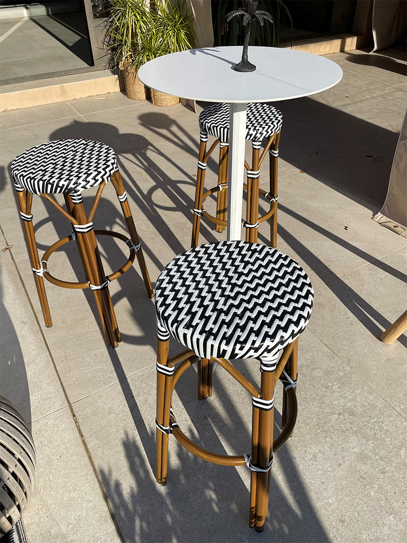 Le tabouret Paris Bistrot est proposé à la location pour vos événements. Sa structure en rotin naturel et son assise tressée reprennent les codes des terrasses bistrot, avec une finition blanc et cappuccino qui apporte un rendu lumineux et facile à intégrer. Il est parfait autour d’un bar ou de mange debout, pour créer une ambiance conviviale et soignée. Le tabouret Paris Bistrot permet d’apporter du caractère sans charger la scénographie, tout en restant cohérent avec des univers naturels, méditerranéens ou plus urbains.