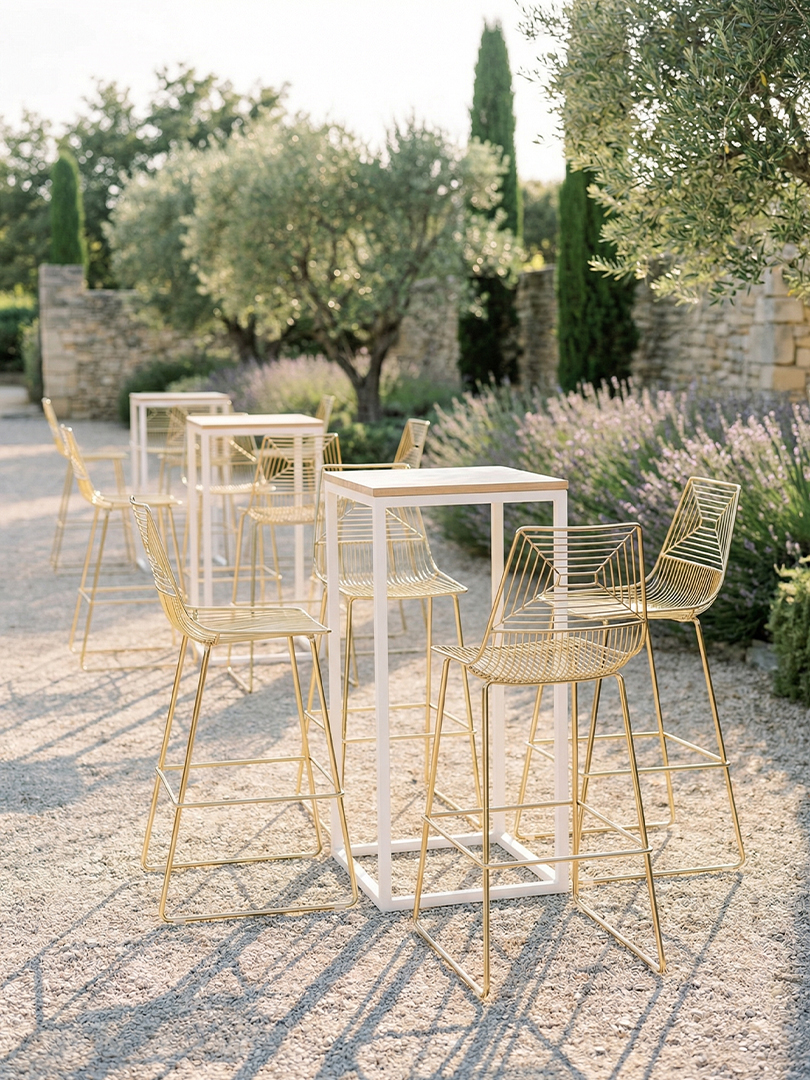 Le tabouret Élise apporte une présence lumineuse avec sa structure en métal doré et son dessin ajouré. La ligne reste légère visuellement, mais l’assise est stable et agréable pour un format cocktail.