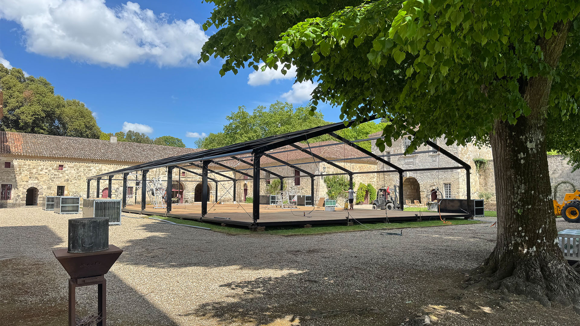 L’assemblage fait appel à des moyens techniques adaptés à l’ampleur du projet : nacelles élévatrices, chariots télescopiques, équipements de levage et outillage professionnel permettent de positionner les modules, d’aligner les structures et de poser les vitrages avec exactitude. Chaque élément est contrôlé, ajusté et sécurisé afin de garantir une parfaite stabilité et une lecture architecturale irréprochable.